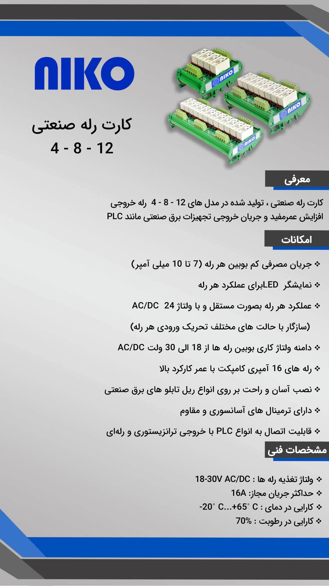 کارت رله‌های شرکت نیرو نیک پرداز کهربا از بهترین نوع رله‌ها تولید می‌گردد. کارت رله‌های این شرکت با رله‌هایی تولید و عرضه می‌گردد که در رله‌های آن از گاز بخصوصی استفاده شده و هرگز اکسید نشده یا خال نمی‌زند و به خوبی بیشترین هدایت الکتریکی بین پلاتین‌ها را ایجاد می‌کند. وجه تمایز این رله‌ها نسبت به دیگر رله‌ها در این خصوصیت ذکر شده می‌باشد.