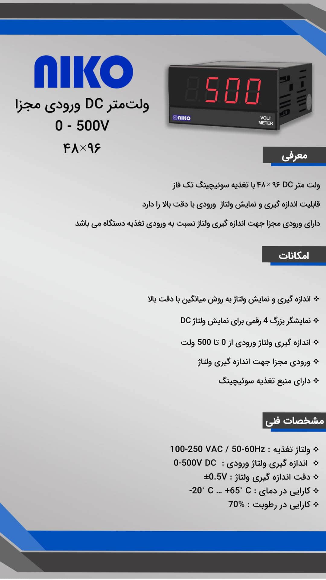 - اندازه گیری ولتاژ ورودی : 0 تا 500 ولت DC